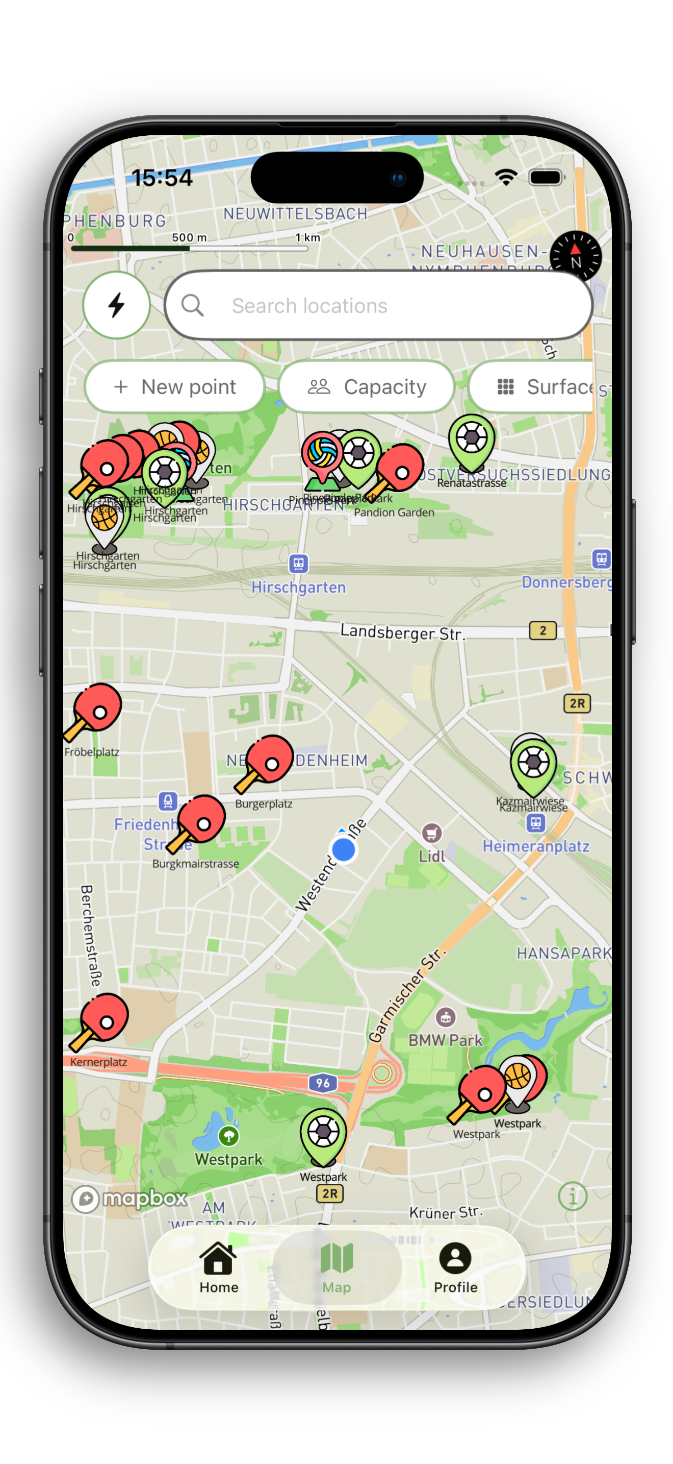Discover the open sport facilities nearby, using the interactive map in MovePoints. Apply dynamic filters on sport art, surface type and capacity